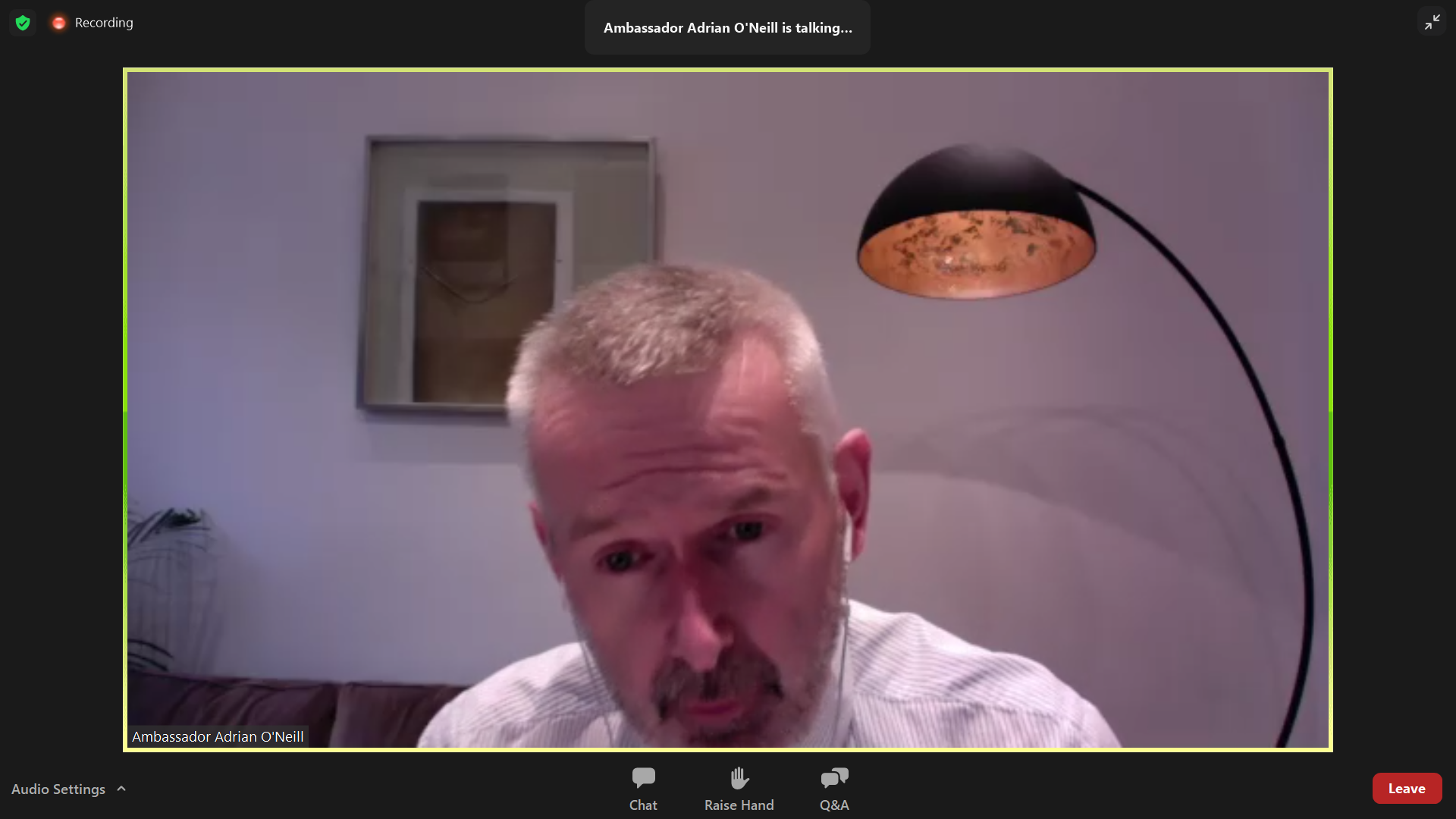 Ambassador Adrian O’Neill continued the theme in his address referring to the “tough year” we have all faced. He praised the spirit of collaboration shown by Irish community and cultural organisations in their response to the crisis and said, “The challenge now is to sustain this collaborative effort and response during the winter and into spring.” He concluded by assuring attendees that although the Embassy was closed to visitors due to the recent lockdown, “metaphorically our door remains open”.